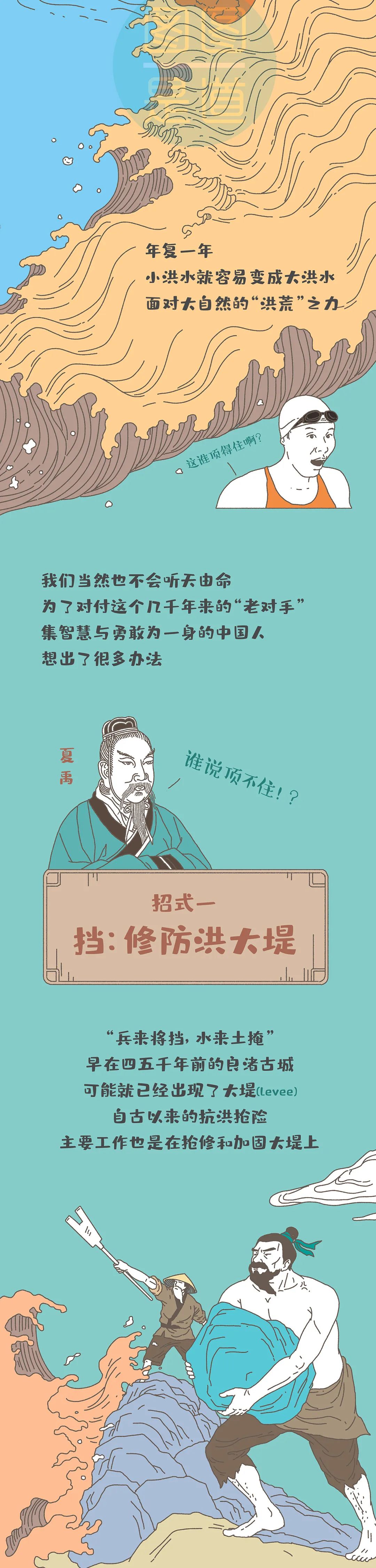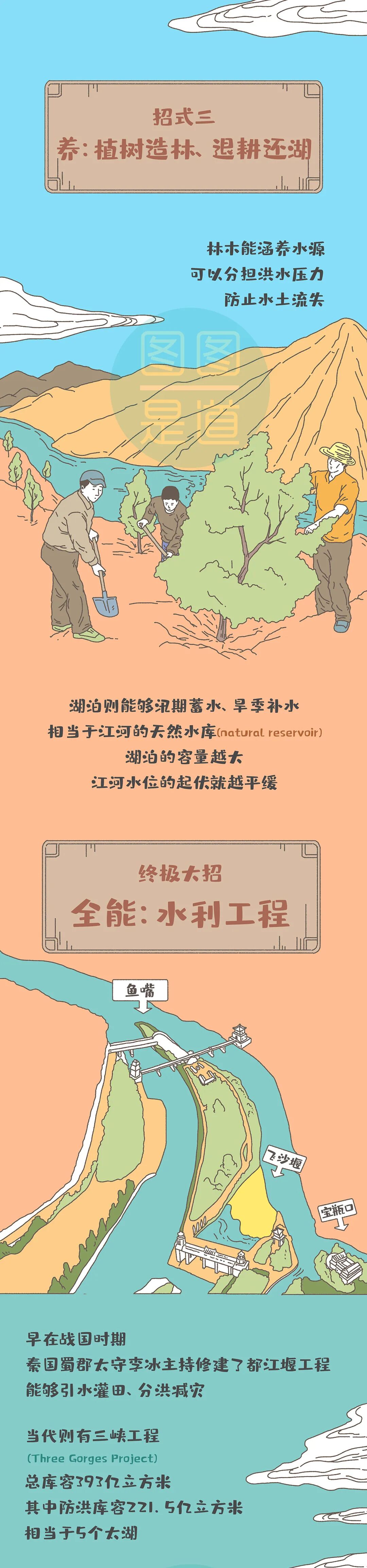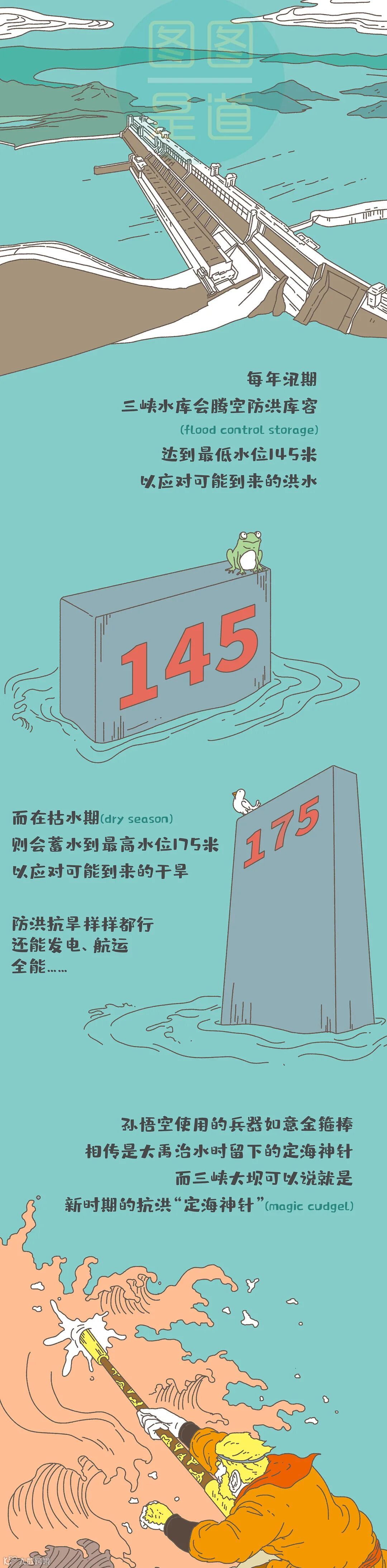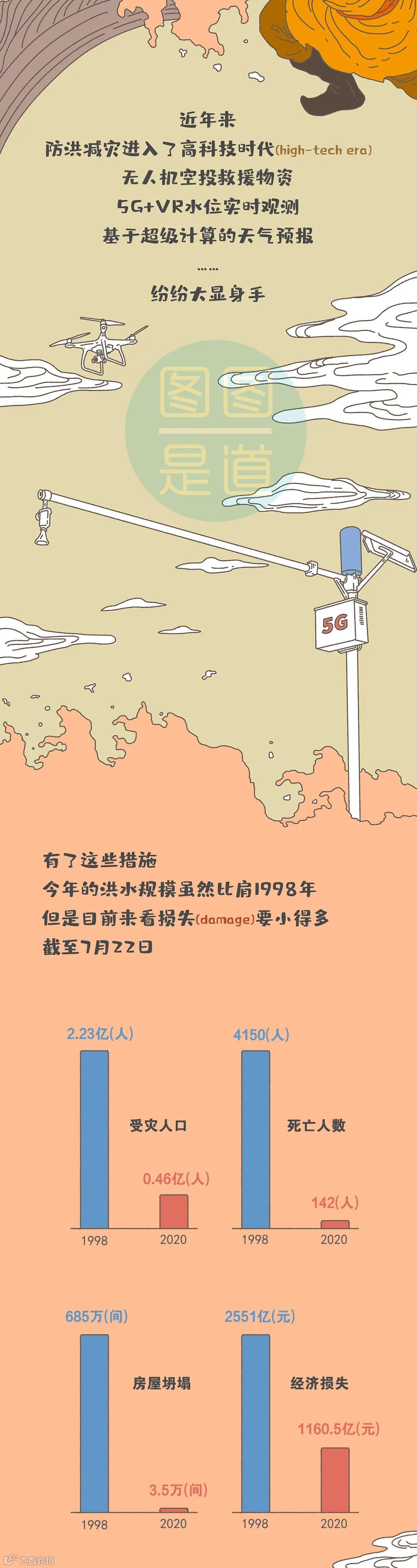 天地玄黄,宇宙洪荒相传在远古时期万物一片混沌(chaos)这时天地间发生了一次巨大的洪水(flood)几乎将世界毁灭这种野蛮而恐怖的力量就是洪荒之力特别是对我们这片土地来说洪水一直都是绕不开的劫难(calamity)从唐朝到清朝的1300年里长江流域大型洪灾多达223次进入20世纪几次特大洪灾更是令人刻骨铭心1931年江淮大水,死亡40-400万人1954年长江特大洪水,死亡3.3万人1998年特大洪水,死亡4150人洪水的梦魇笼罩在长江沿岸挥之不去为什么几乎一到夏天我国尤其南方就饱受(suffer)洪水威胁呢?1、自然因素这要从气候说起我国东部地区是典型的季风气候(monsoon climate)每年夏季的东南季风带来太平洋的水汽形成丰富的降水 而在中国南方由于冷暖空气的相持还会形成梅雨季节集中了年60~80%的降水特殊气候造成了每年6~9月的汛期(flood season)这为洪水的产生创造了自然条件