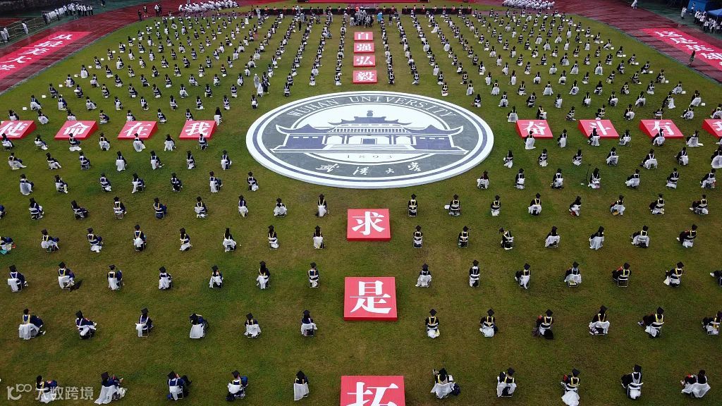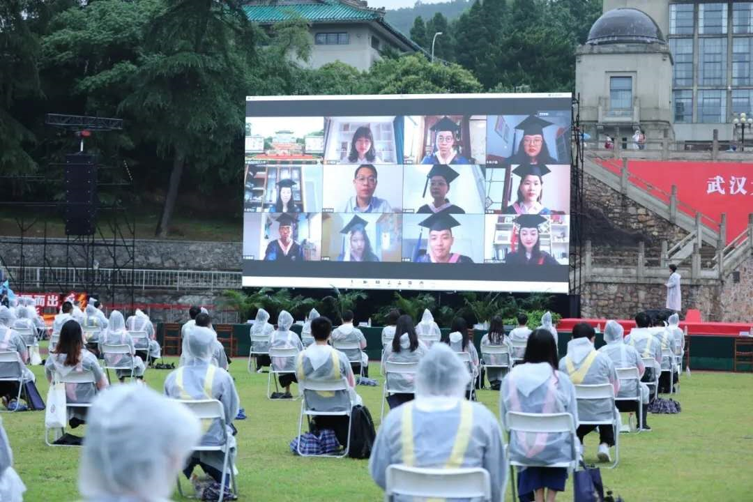 2020年6月20日,武汉大学2020年毕业典礼暨学位授予仪式在雨中举行,660名毕业生身穿雨衣参加毕业典礼