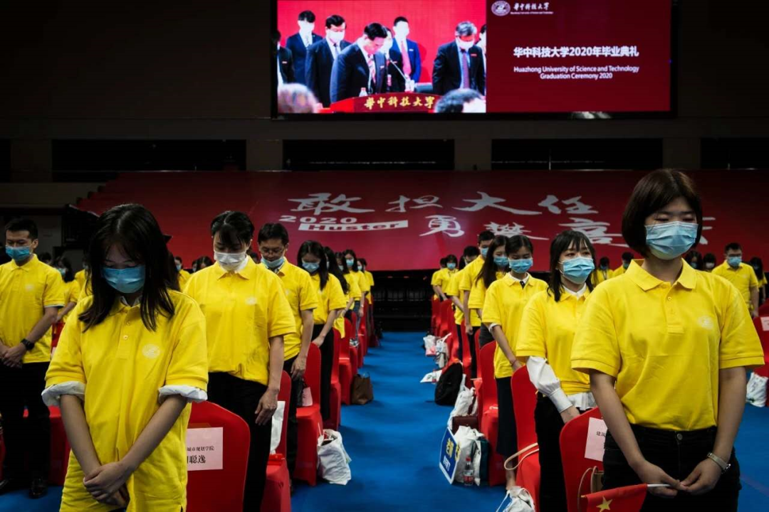 华中科技大学校长李元元院士在致辞中提议,向在战疫中牺牲的烈士和不幸逝世的同胞默哀一分钟。