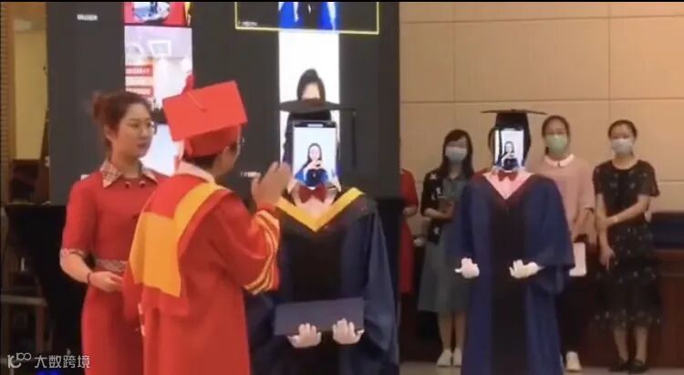 5月22日,一段“云毕业典礼”视频在微博上引发网友关注。视频中,两个机器人身穿硕士服,头顶学位帽,缓缓向导师走来。导师为机器人拨穗并颁发学位证书,坐在家中的毕业生通过机器人搭载的平板向导师致意问好。