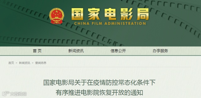 7月16日,国家电影局发布《国家电影局关于在疫情防控常态化条件下有序推进电影院恢复开放的通知》。通知称,低风险地区在电影院各项防控措施有效落实到位的前提下,可于7月20日有序恢复开放营业。中高风险地区暂不开放营业。