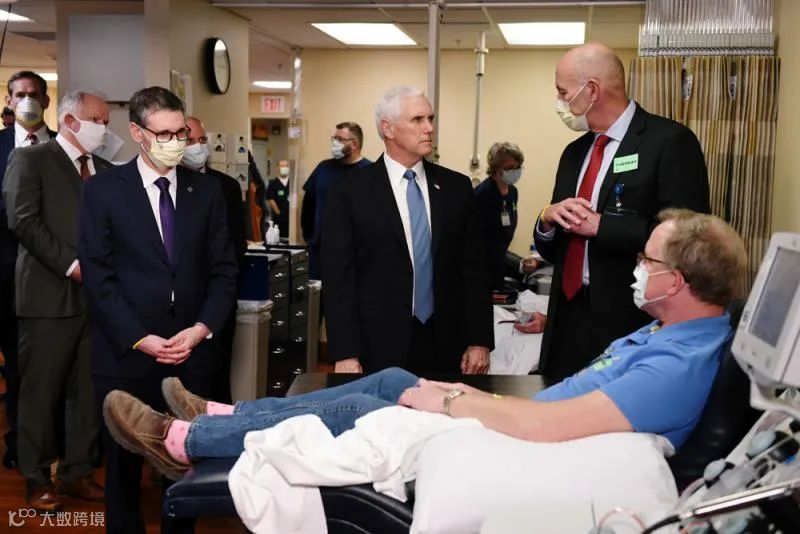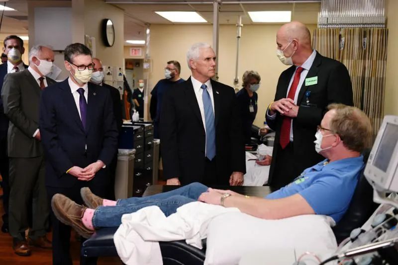 这一点上,副总统彭斯倒是也和总统步调一致。彭斯4月28日视察一间医疗中心时,整个一屋子的人,只有彭斯未佩戴口罩。甚至还和曾经确诊新冠肺炎但已经康复的中心职员进行了交谈。