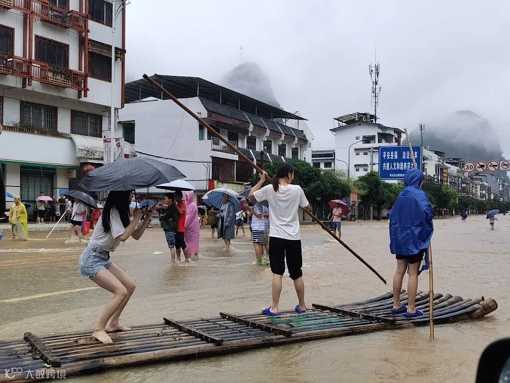 6月7日,广西桂林阳朔县城,暴雨造成严重内涝。人们在街上撑竹筏。图源:人民视觉