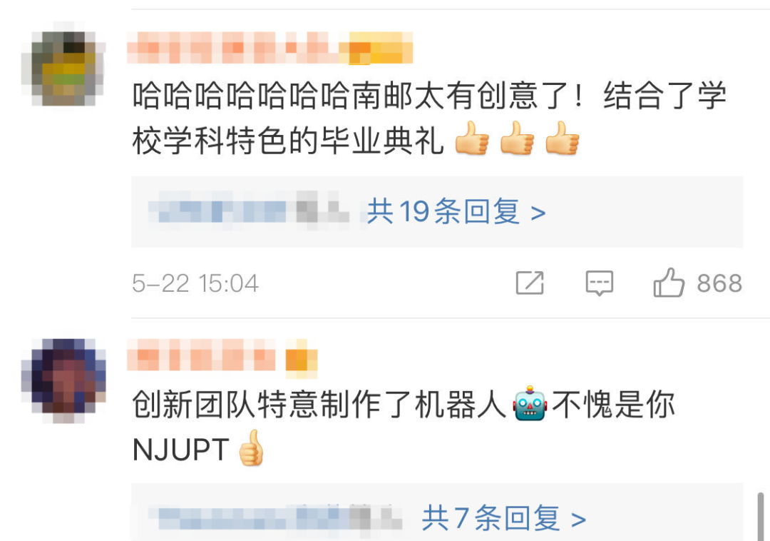 南京邮电大学则运用自己的设计制造的机器人,实时连线摄像头另一端的毕业生,院长为代表着毕业生的机器人一一拨穗。