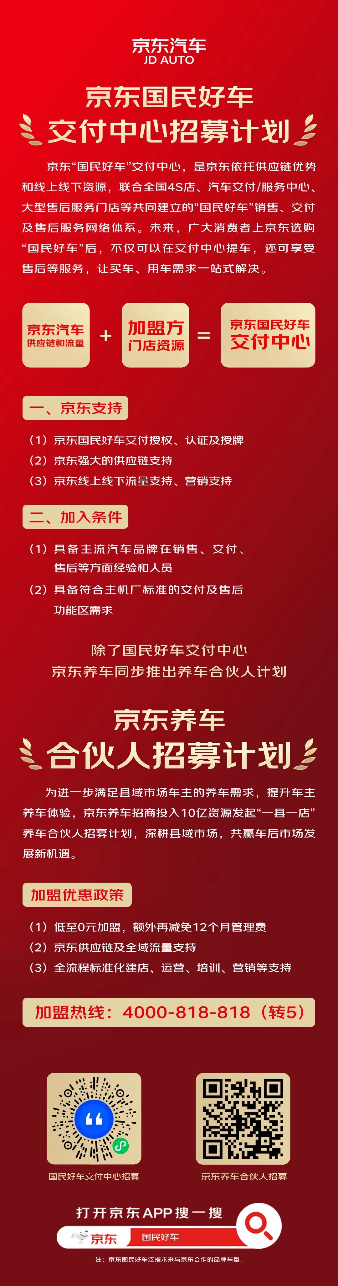 京东黑板报京东联合宁德时代、广汽集团宣布推出“国民好车”后受到广泛关注。未来,我们还将与更多品牌合作,推出更多的“国民好车”。在此,我们正式推出“国民好车”交付中心招募计划,邀请广大4S店、汽车交付/服务中心、大型售后服务门店等行业参与者加入其中,一起打造更多“国民好车”销售、交付及售后服务网络,为广大用户提供一站式的买车、用车新体验,并为行业创新发展贡献力量!