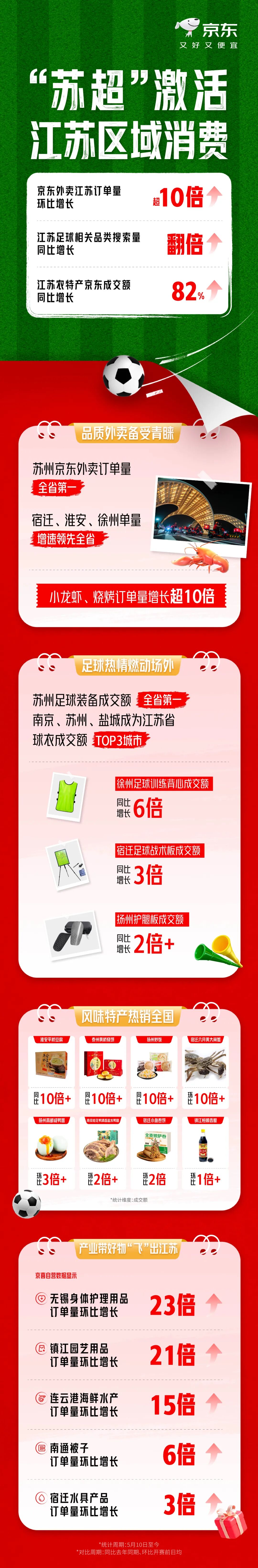 “苏超”赛事激活了江苏省乃至全国的足球相关消费。京东数据显示,开赛以来江苏球衣、球鞋、球袜、球门等足球相关品类搜索量同比去年增长翻倍,其中苏州相关商品总成交额位居全省第一,南京球衣成交额则一枝独秀,徐州足球训练背心成交同比增长6倍。