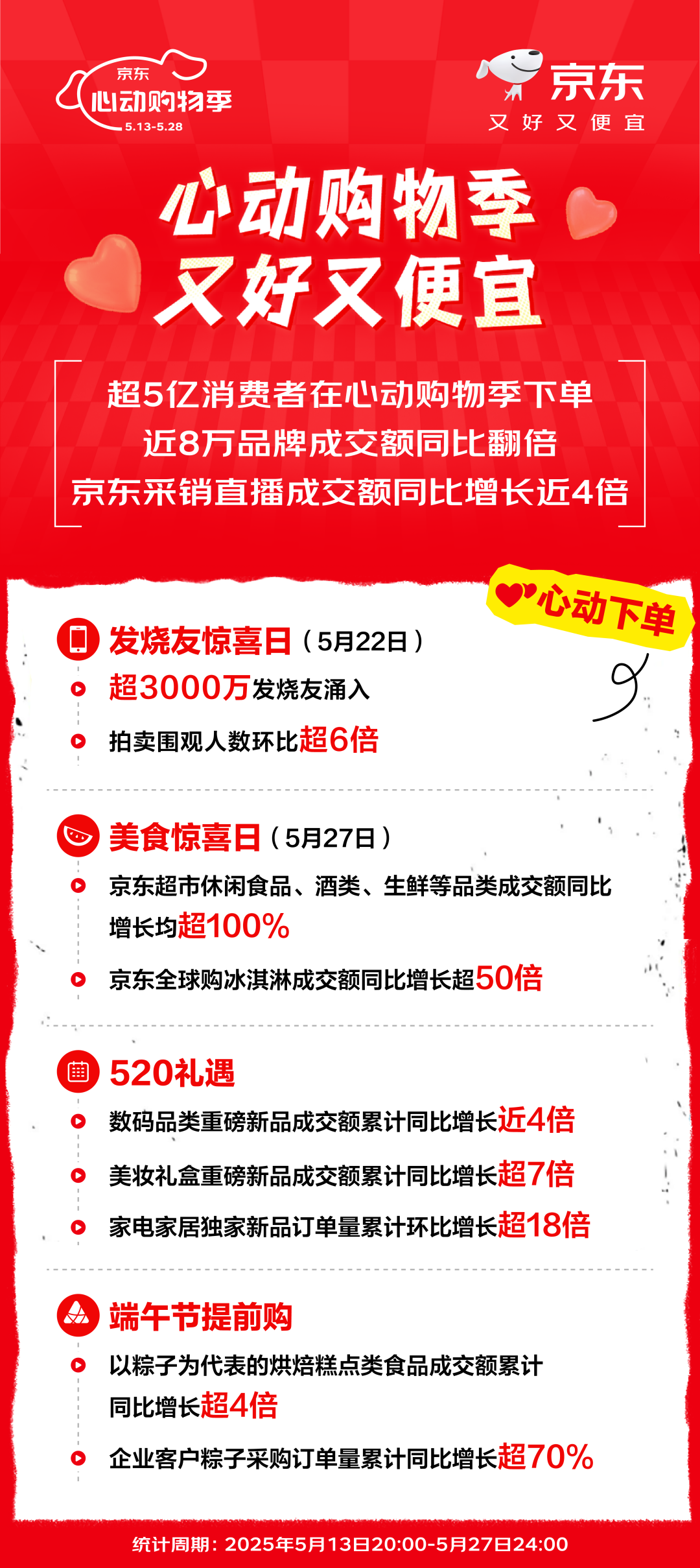截至5月27日24点,超5亿消费者在京东心动购物季下单,近8万品牌成交额同比翻倍,京东采销直播成交额同比增长近4倍。