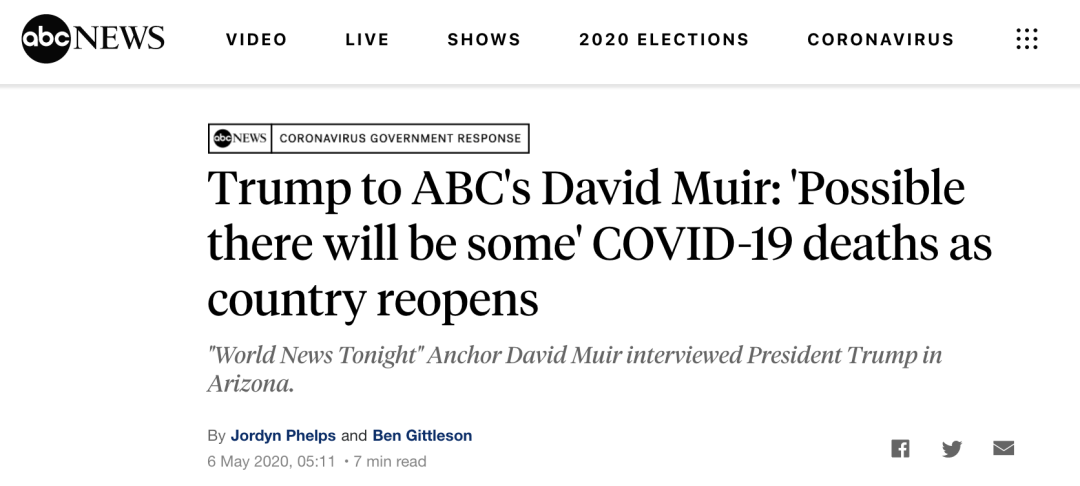这是特朗普自疫情恶化几个月以来首次接受重大采访,主持人在节目中问道:“您是否认为这是我们面临的现实?重新开放国家会导致死亡?”