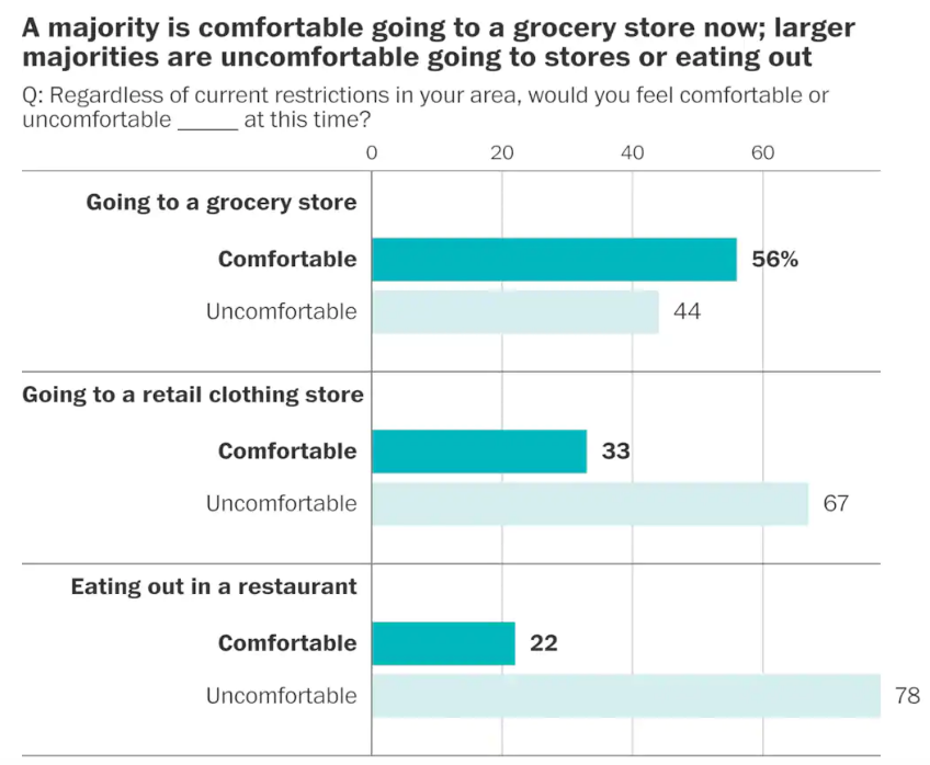 But 67 percent say they would be uncomfortable shopping at a retail clothing store, and 78 percent would be uncomfortable eating at a sit-down restaurant.