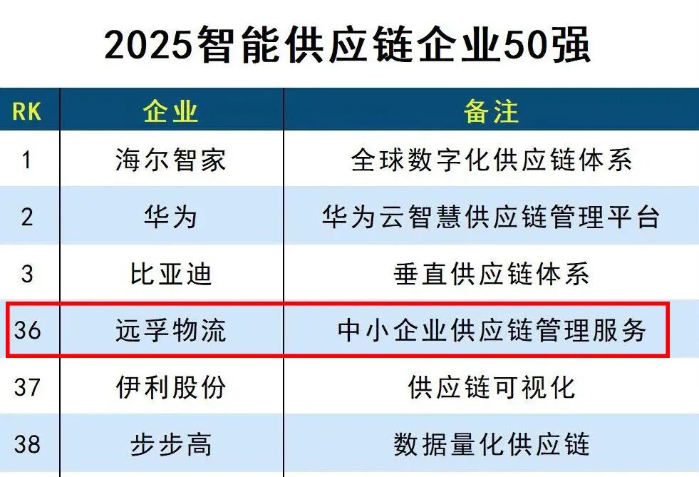 2025智能供应链企业50强发布,远孚物流位列第36位