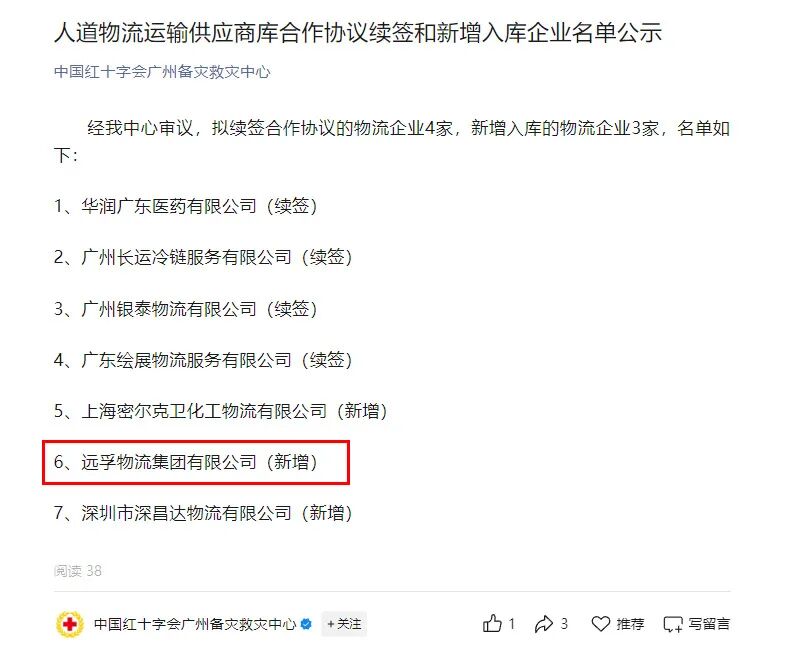 此次供应商库的调整,共包含4家续签合作企业与3家新增入库企业。这标志着中国红十字会广州备灾救灾中心对远孚物流集团在应急物流、资源调配及社会责任履行等方面综合实力的高度认可。