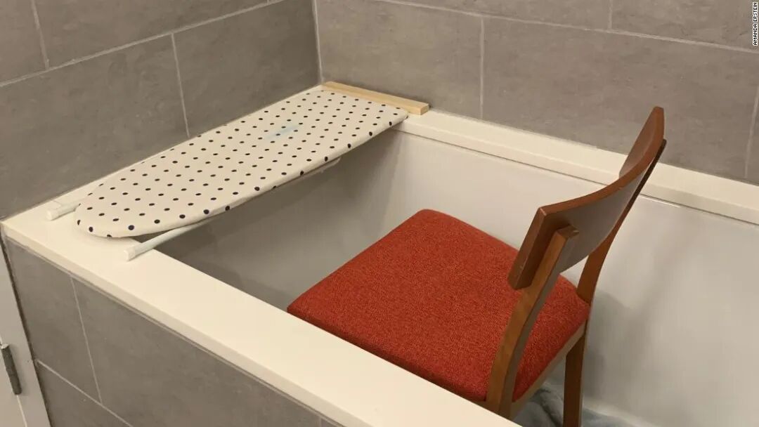 "So my handy husband used our soaking tub, a mini-ironing board on which he can put his laptop, and a kitchen chair to create a second workspace in the master bath," Epstein writes.