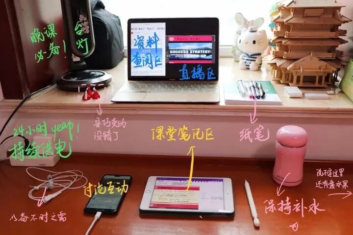 不能回珈,慢慢适应网课学习的方法。电脑挡住摄像头防止上课误开(惨痛的记忆哈哈哈),桌上除了学习工具资料还有喜欢的东西,比如书、音乐和画。不知何时能还回去的从图书馆借的书,好朋友送的故宫猫猫,一枝万年青已陪我生长好多年,书桌满是生活的气息。