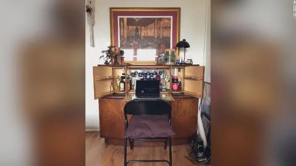 Emma Northcott, who is based in London, is using her liquor cabinet while she waits for a desk that she ordered online to come in.