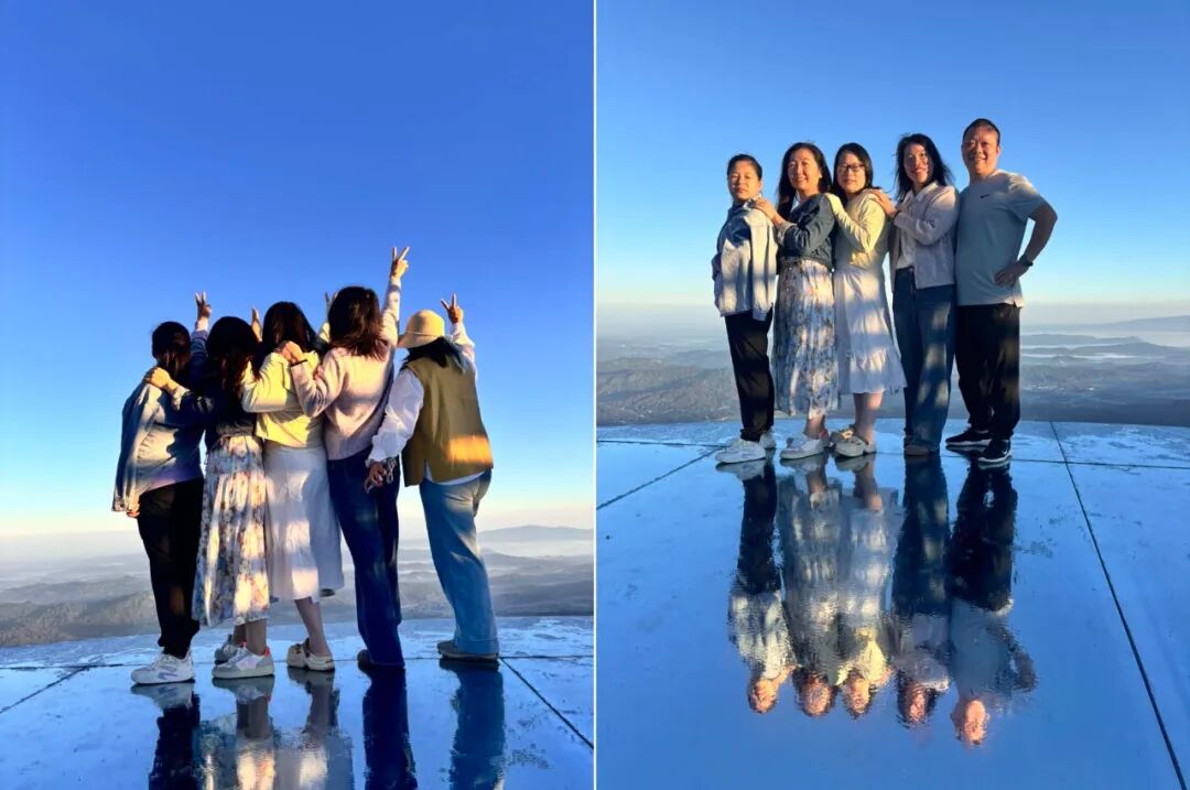 凌晨5:15,团队披星登顶观天台。当晨光刺破云海,16℃的清凉中,众人并肩记录红日喷薄的震撼瞬间,寓意湘鄂协作如朝阳蓬勃。
