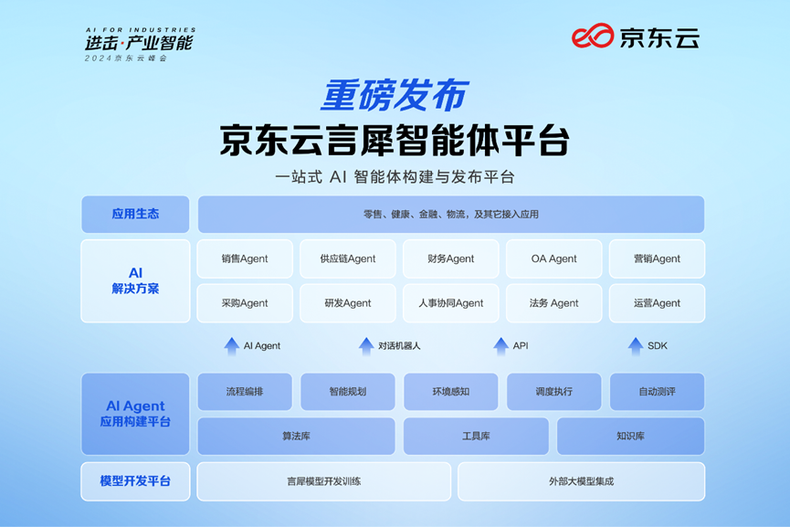 围绕企业使用通用大模型、开发热门应用,京东云发布三大智能平台、五大领先技术产品,从基础设施到Agent应用,构建全场景的大模型服务能力,持续推动大模型落地产业。