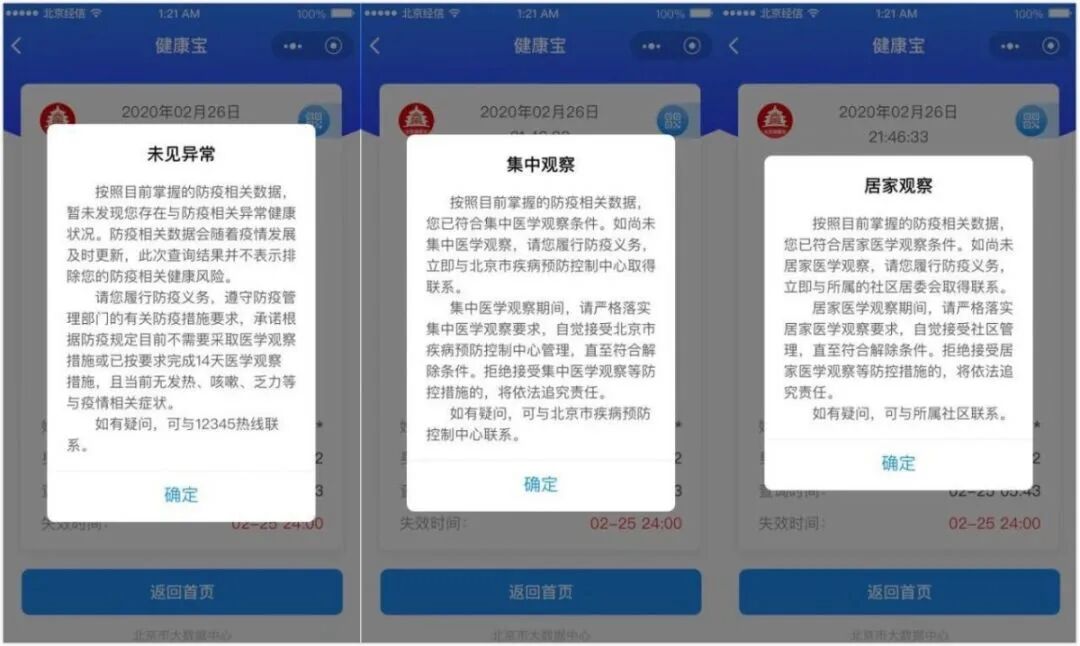 查询结果包含“集中观察”、“居家观察”以及“未见异常”三种状态,分别用红色、黄色以及绿色进行标识。