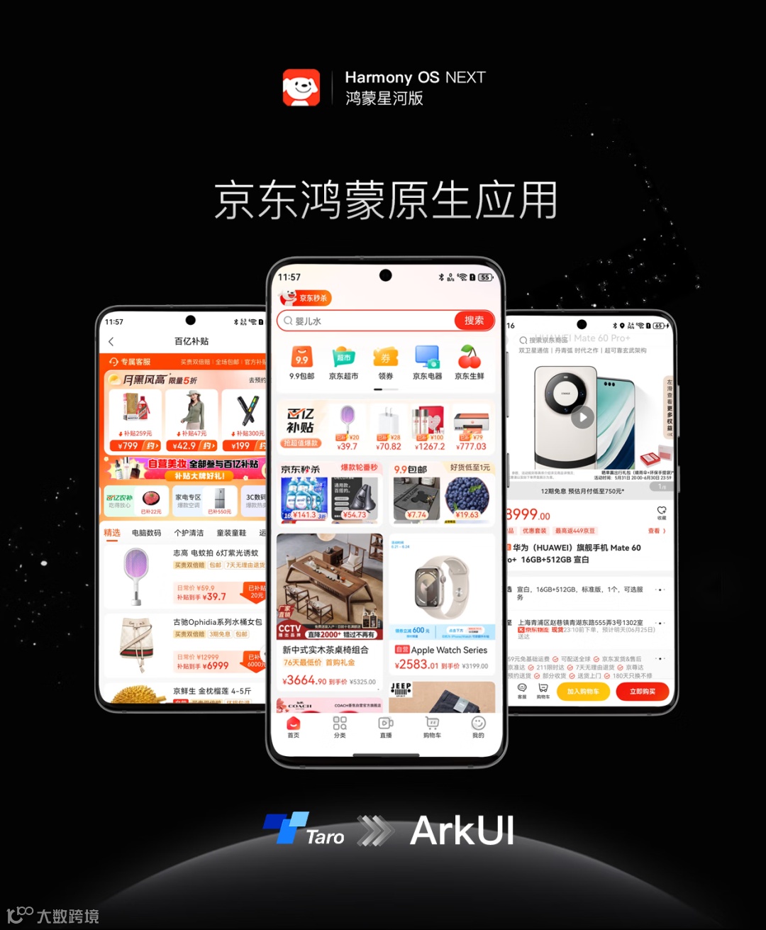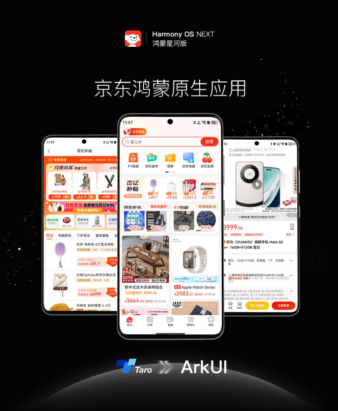 在适配鸿蒙操作系统的过程中,京东与华为持续保持着密切的技术沟通与共创,双方共同攻坚行业适配难点,并推动多端统一开发解决方案Taro在业界率先实现对鸿蒙 ArkUI 的原生开发支持,为京东APP快速适配HarmonyOS NEXT以及后续鸿蒙生态建设搭建了基础技术支持。