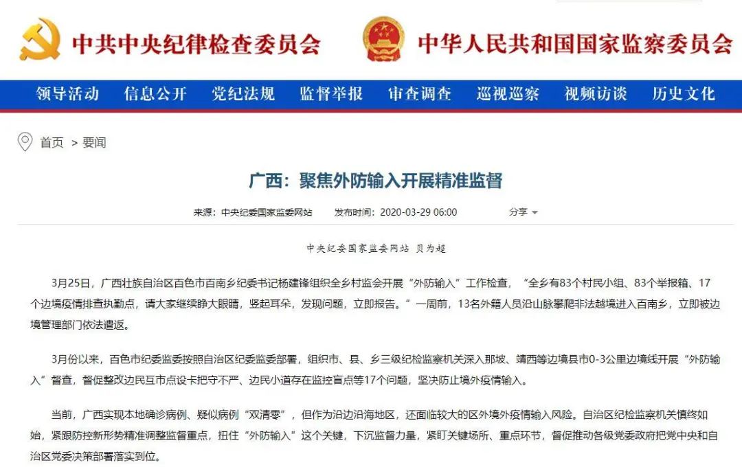 据中央纪委国家监委网站消息,3月25日,广西壮族自治区百色市百南乡纪委书记杨建锋组织全乡村监会开展“外防输入”工作检查。