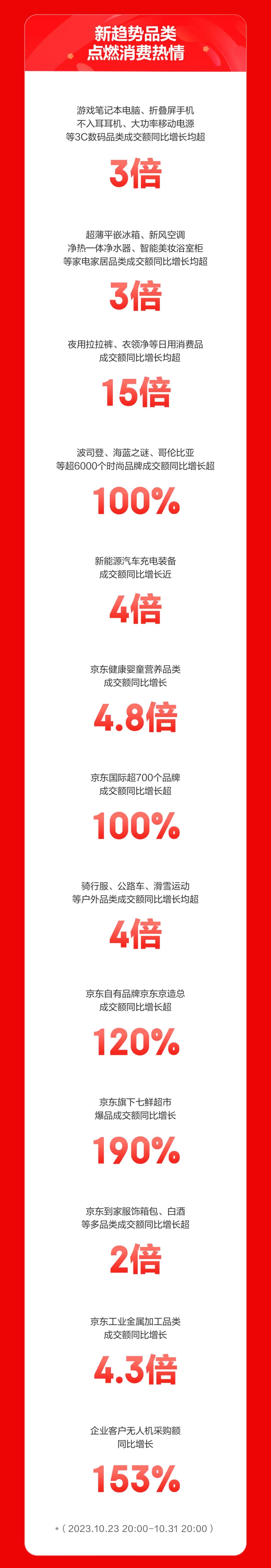 在空前的优惠力度以及海量品质好物的充足供给下,消费者的购物热情被充分调动起来。京东11.11首周,大量品牌和商家刷新销售新纪录,近1.5万个品牌成交额同比增长超5倍,诸多新趋势品类迎来销售爆发。