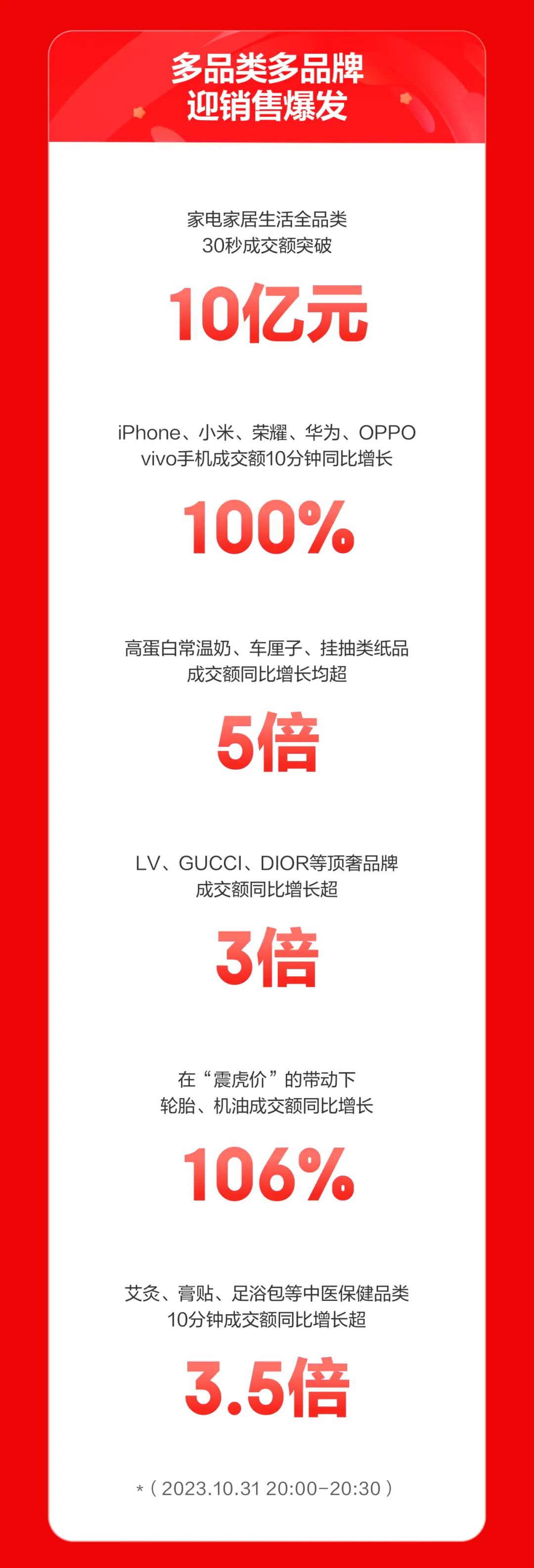 10月31日晚8点开场仅30秒,家电家居生活全品类成交额破10亿元。