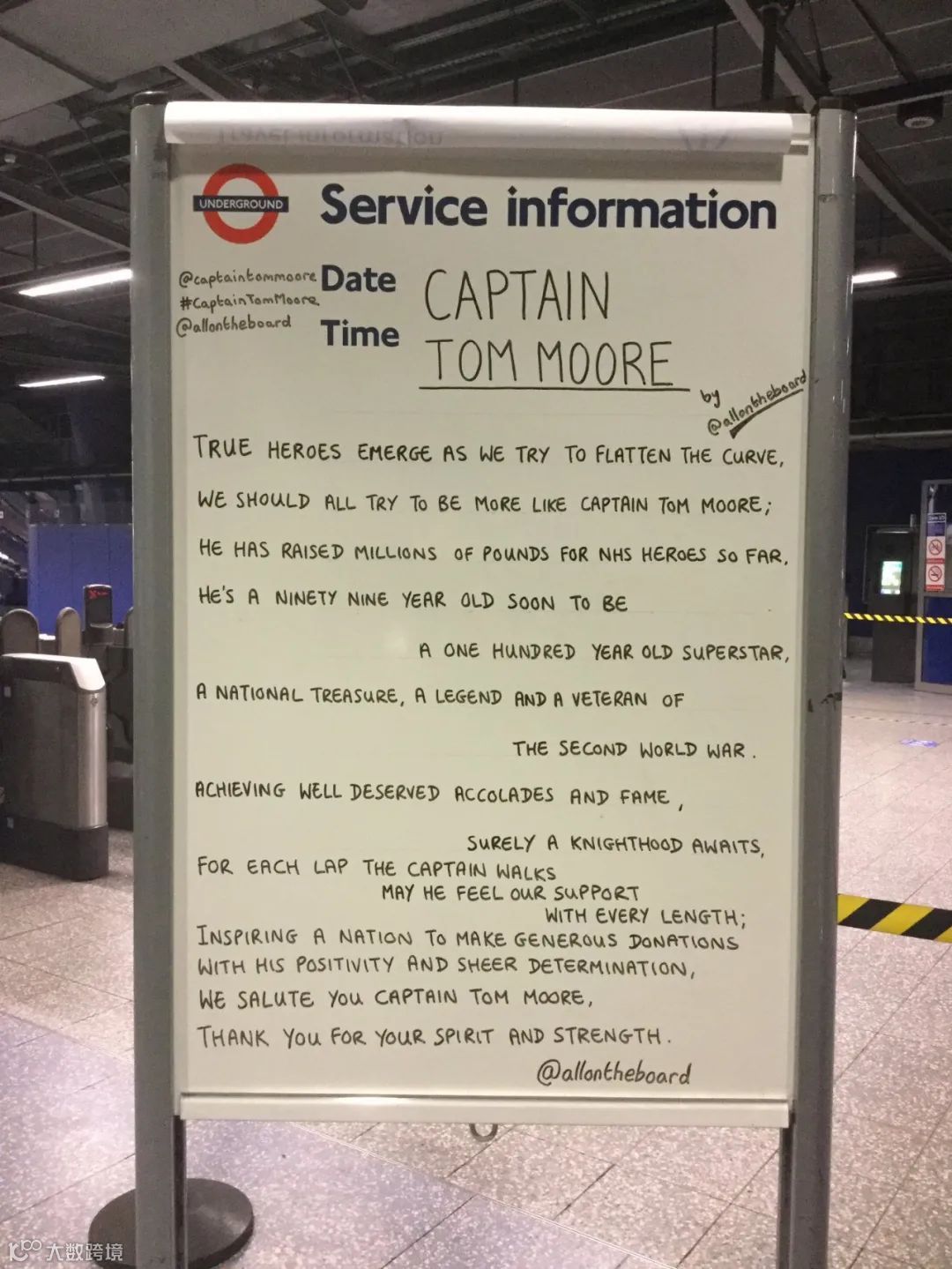 当前英国全境都在采取封闭措施,地铁站的人流量骤减。可尽管如此,伦敦地铁还是手写了暖心告示,致敬汤姆上尉。不论有多少人能看到,这块告示牌就静静伫立在那里,完成它的使命。