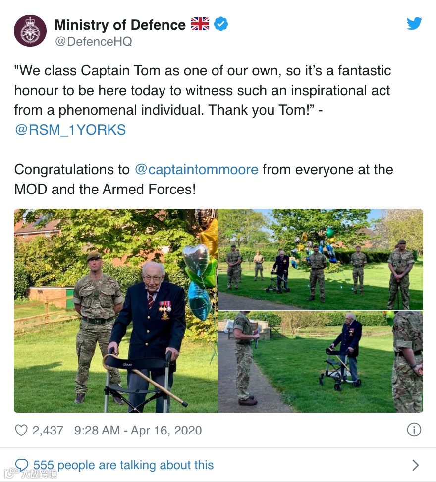 “我们将汤姆上尉视作我们中的一员,今天能在这里亲眼目睹一位杰出的人物作出如此鼓舞人心的举动,真的太荣幸了!谢谢你,汤姆!”