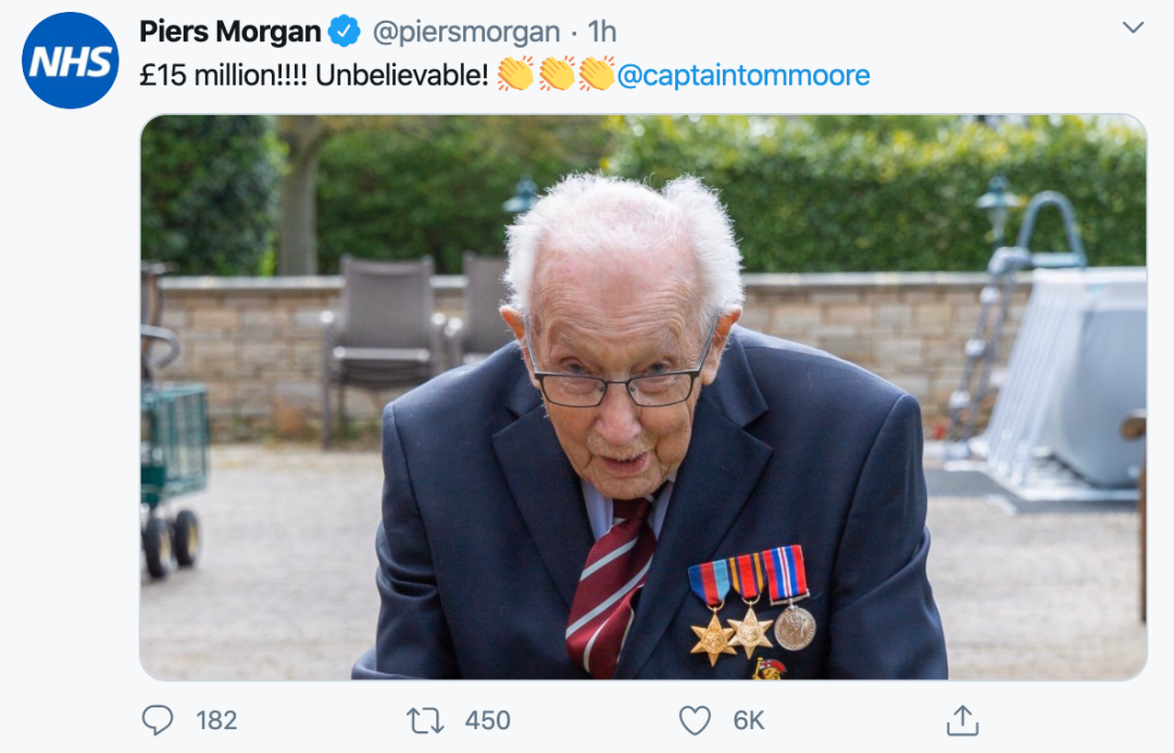 周四,当摩尔正式完成行走挑战时,筹集到的善款已超1500万英镑,截至发稿,这一数字又超过了2100万英镑。