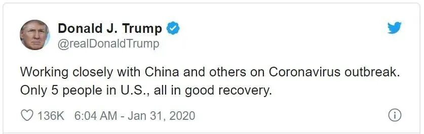 当天,特朗普在推特上说,正和中国等国家就新冠疫情展开密切合作,美国只有5人感染,都在恢复中。