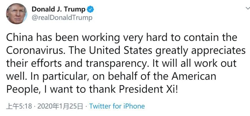 特朗普在通话中对中国应对疫情举措给予积极评价,并在当天发推特称,中国正在采取严格的防控,将会取得成功。我们正在与中国密切合作。