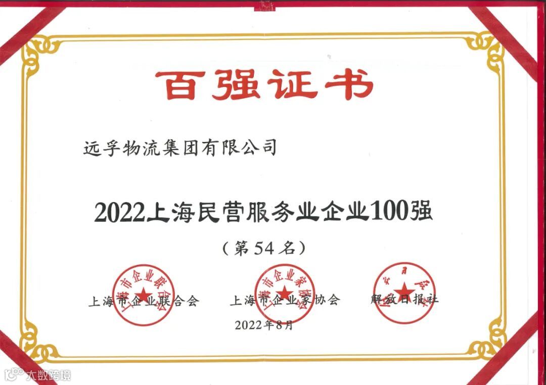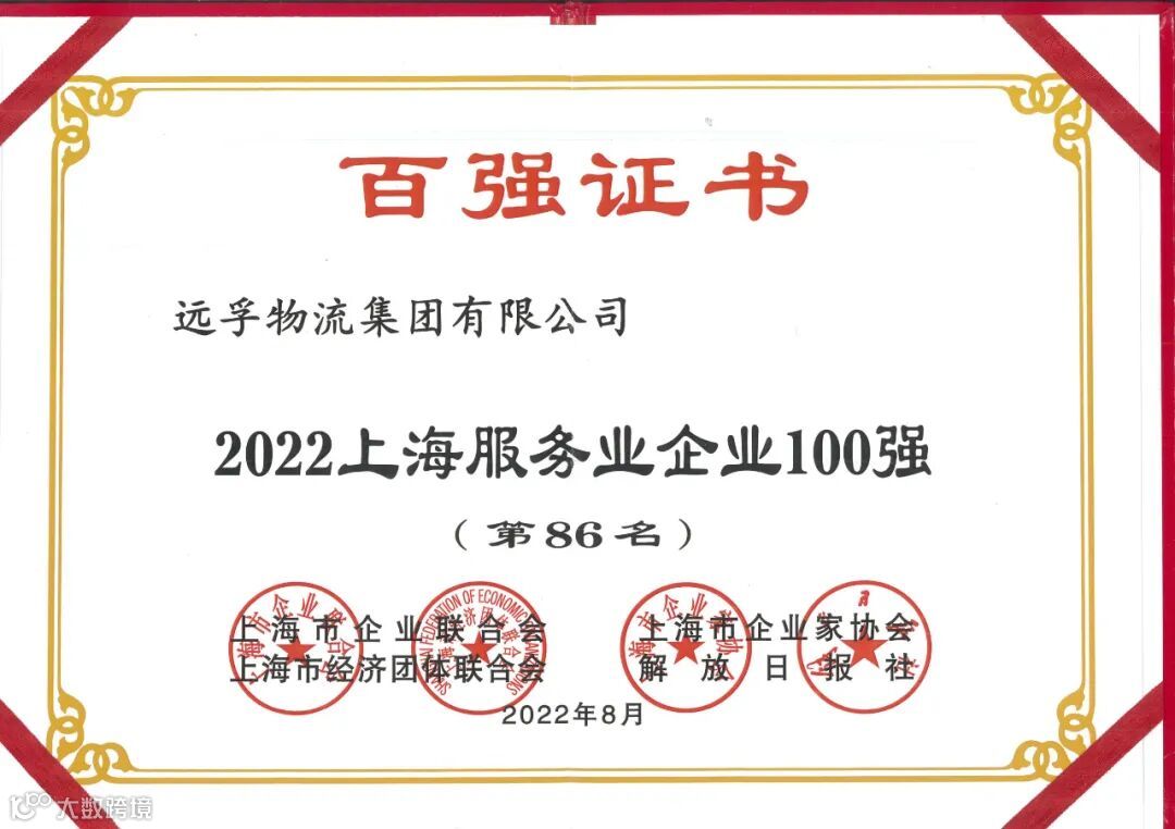 远孚物流上榜2022上海服务业企业百强第86位、上海民营服务业企业百强第54位