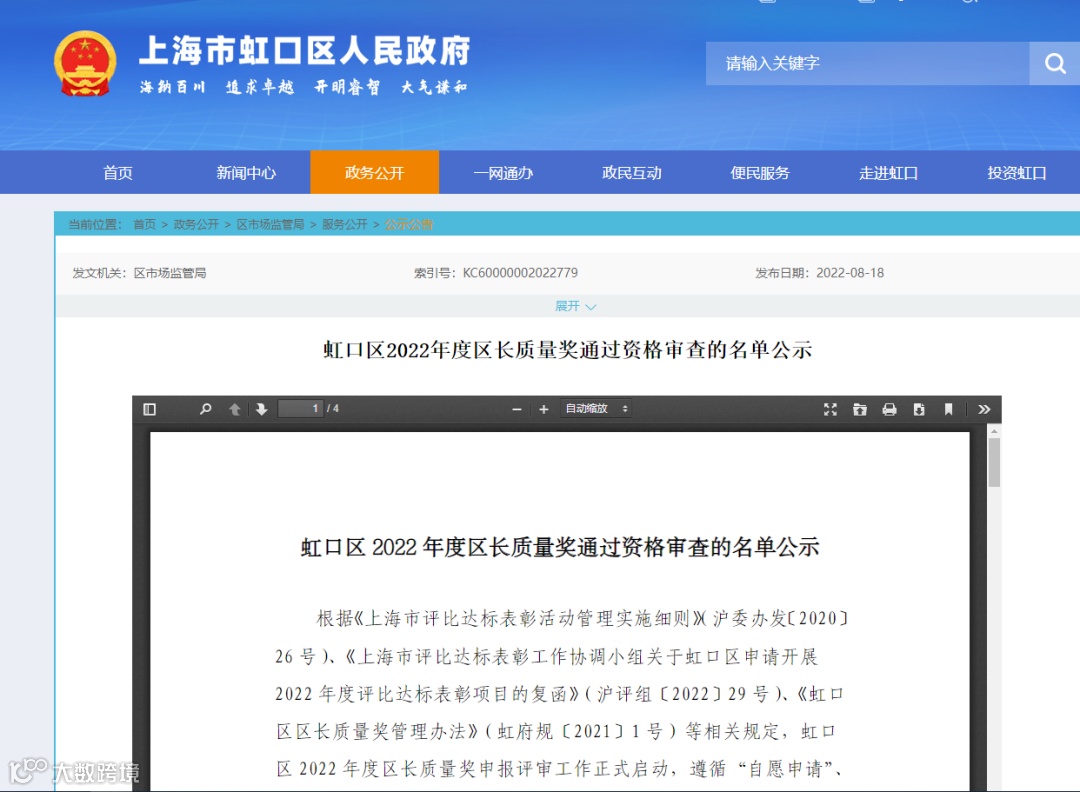 远孚物流入围2022年度上海市虹口区区长质量奖