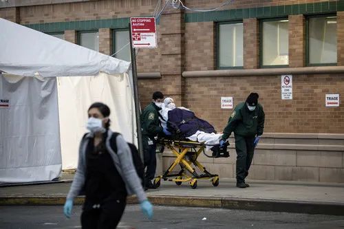 3月28日,医护人员将病人送往美国纽约布鲁克林一家医院的急诊室 图源:新华社