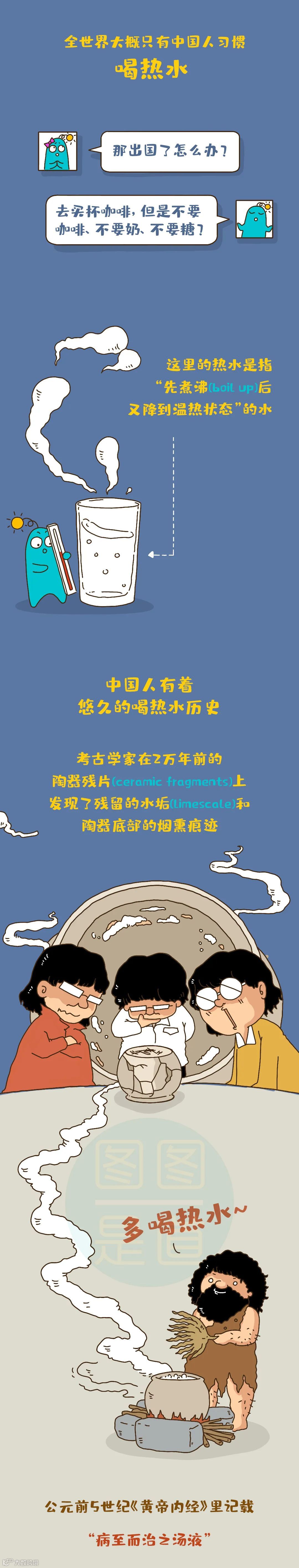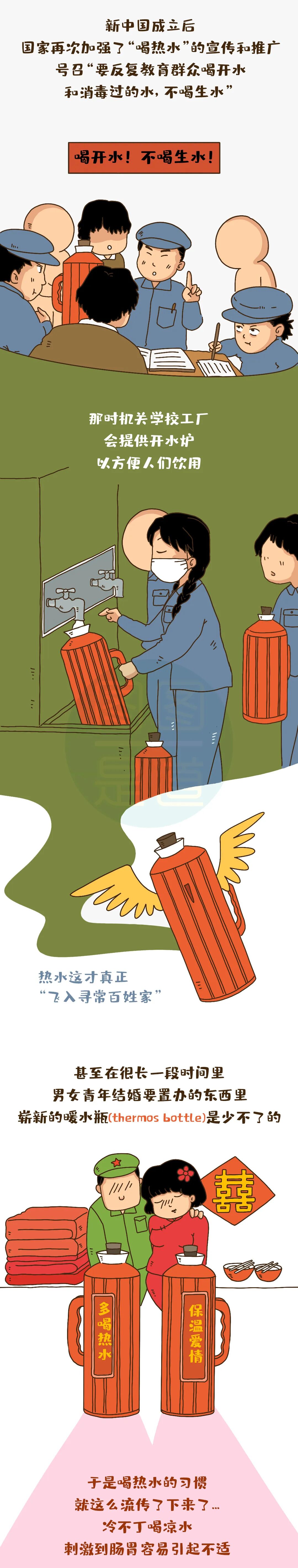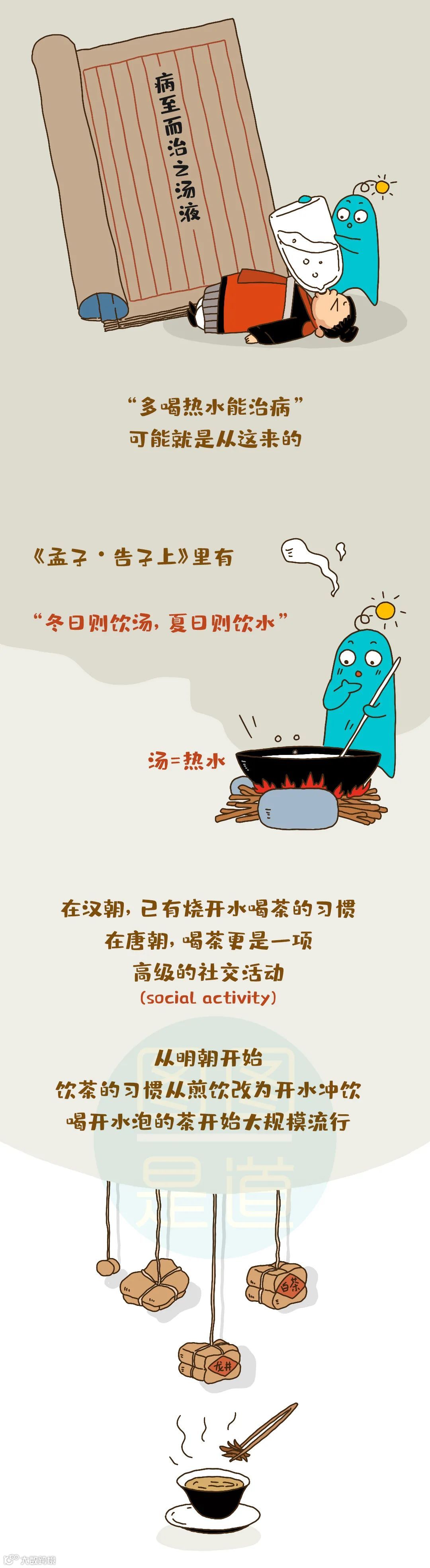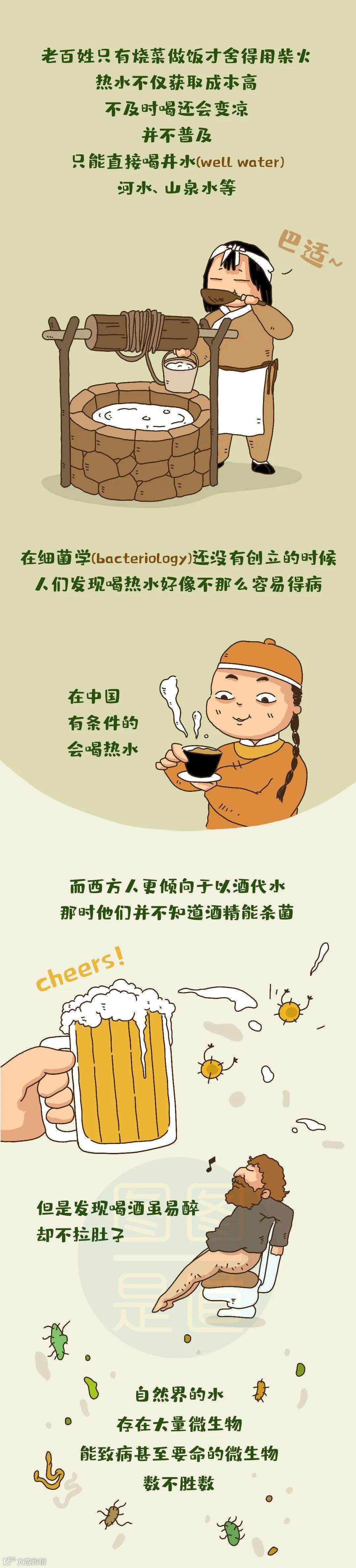中国人最爱喝啥?茶?红糖水?白酒?错!……热水!全世界大概只有中国人习惯喝热水,这里的热水是指“先煮沸后又降到温热状态”的水。中国人有着悠久的喝热水历史,考古学家在2万年前的陶器残片上,发现了残留的水垢和陶器底部的烟熏痕迹。公元前5世纪《黄帝内经》里记载“病至而治之汤液”,“多喝热水能治病”可能就是从这来的。《孟子·告子上》里有“冬日则饮汤,夏日则饮水”,在汉朝,已有烧开水喝茶的习惯,在唐朝,喝茶更是一项高级的社交活动。从明朝开始,饮茶的习惯从煎饮改为开水冲饮,喝开水泡的茶开始大规模流行。不过在古代无论是喝热水还是喝茶,都只有贵族(nobility)才能享受到,因为......太费柴火!老百姓只有烧菜做饭才舍得用柴火,热水不仅获取成本高,不及时喝还会变凉,并不普及,只能直接喝井水、河水、山泉水等……