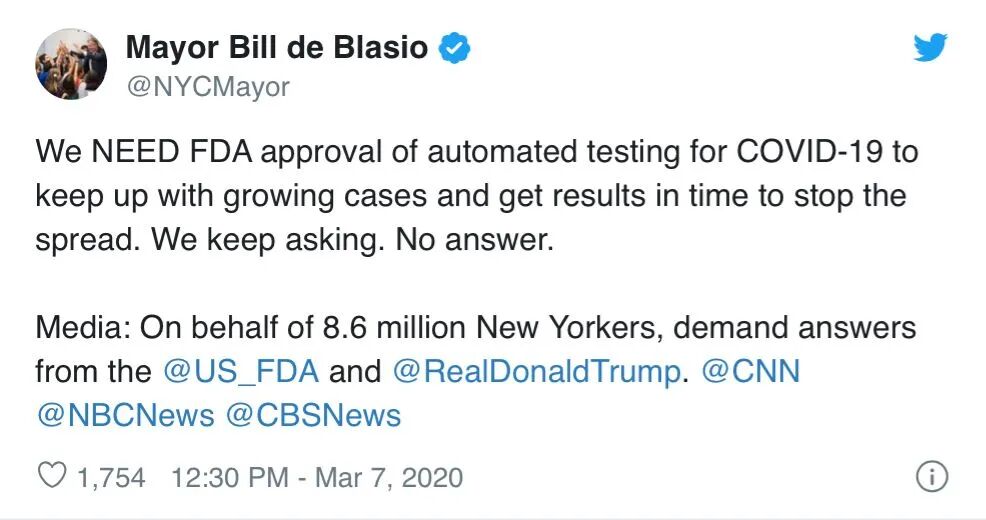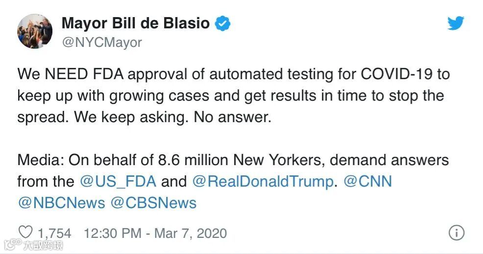 纽约市长白思豪(Bill de Blasio)7日就指责FDA在批准新型检测方法过程中的低效。随着确诊病例数量的飞升,纽约市一直在等待FDA批准市公立实验室启用COVID-19自动化测试方式。但FDA迟迟未有回音,这极大阻碍了对感染者的迅速确诊和有效隔离。