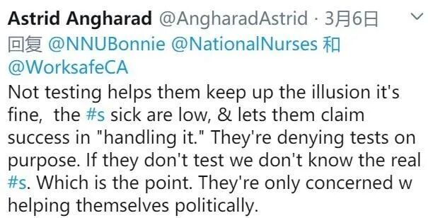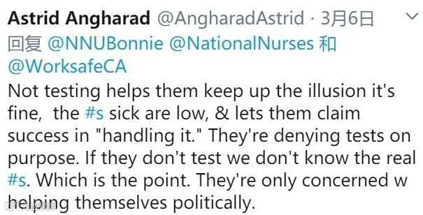 不检测帮他们制造了一种假象,一切都还好,确诊率很低,完全可以控制,他们这是故意的。不检测,我们就不知道真实情况如何。他们只关心自己的政治利益。
