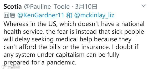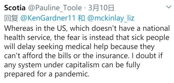 美国没有国民医疗服务体系,我们需要担心的是染病的人因为付不起医药费或医保而拖延救治,我十分怀疑任何资本主义制度下的社会能否充分准备好迎接一场大流行病。