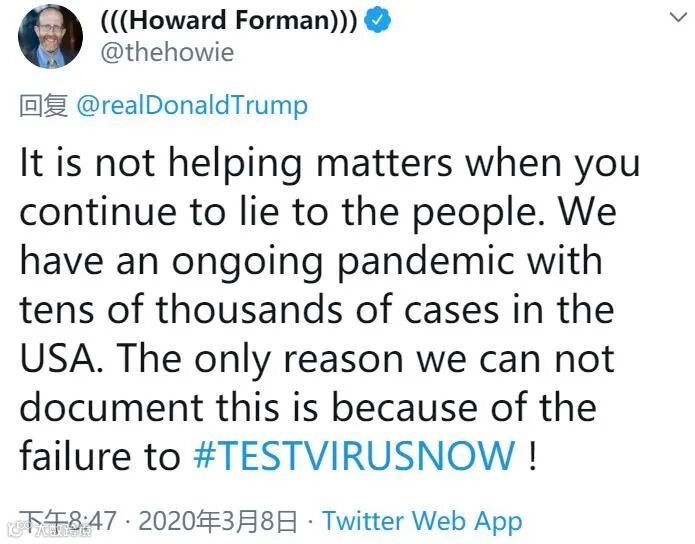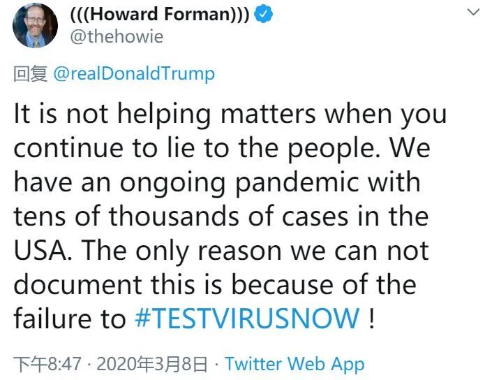 一直向民众撒谎于事无补。我们现在面临的是一场大流行病,美国有成千上万人感染。唯一没有记录这个数字的原因就是:没法检测!