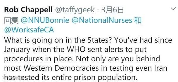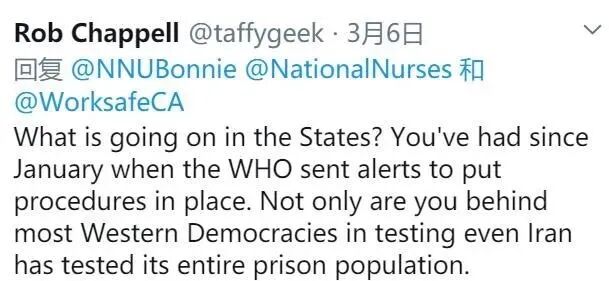 美国这是怎么了?1月份世卫组织发出警告的时候,你们就可以把防控举措搞起来了。现在你不光是在检测方面落后于大多数西方国家,甚至连伊朗都不如,他们都大范围检测国民了。
