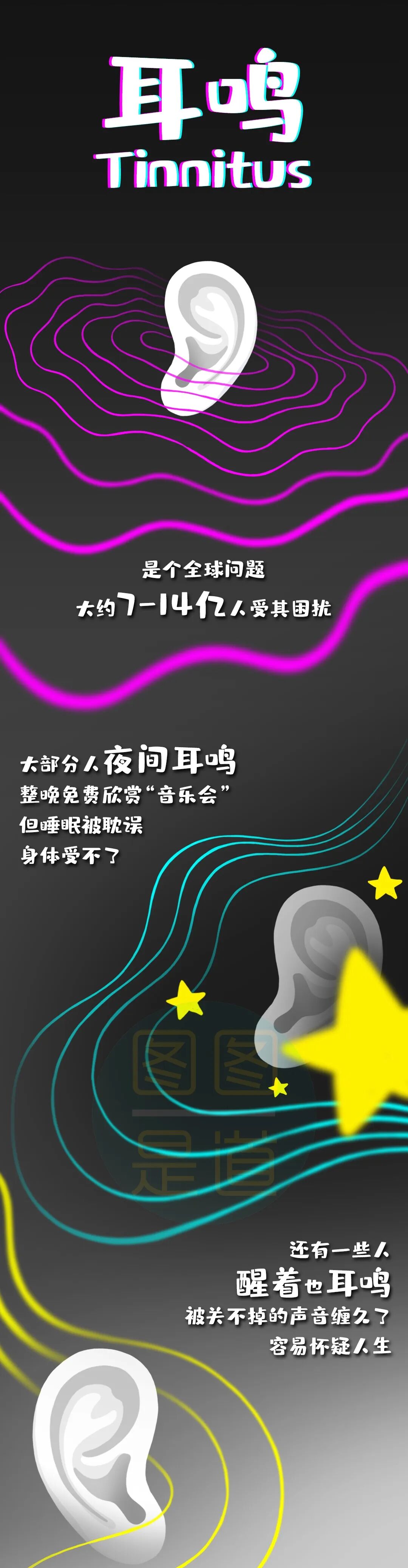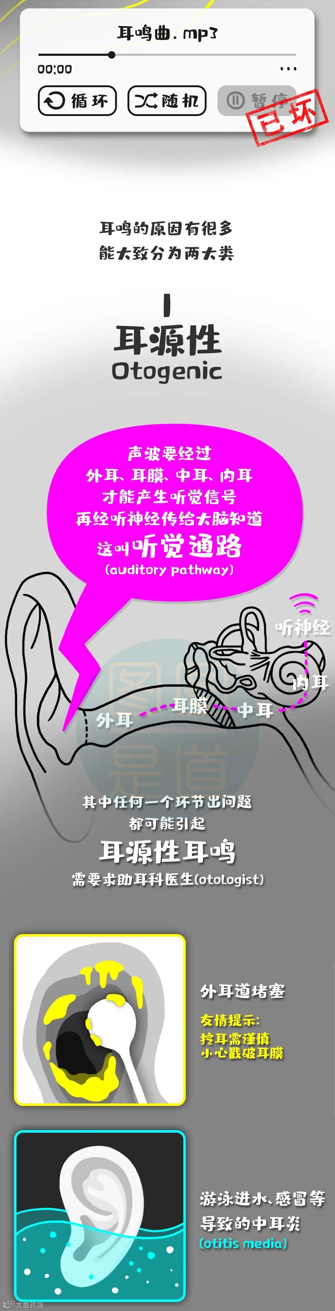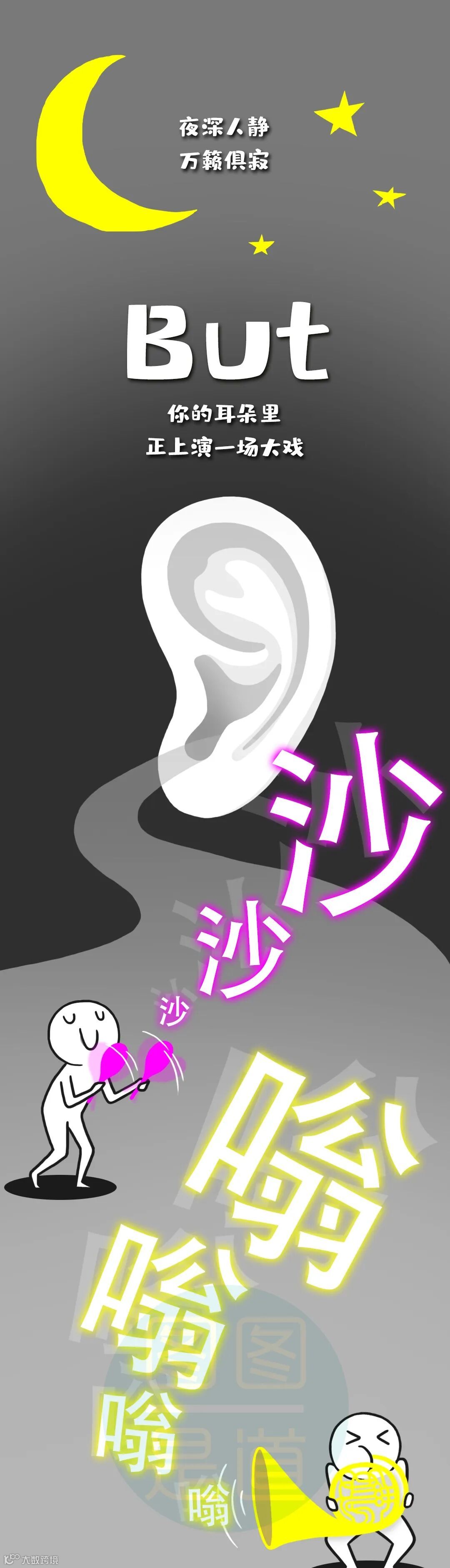 万籁俱寂,你的耳朵里开始上演一场大戏:沙沙~~嗡嗡~~叮叮~咣咣!耳鸣是个全球问题,大约7-14亿人受其困扰,大部分人夜间耳鸣,整晚免费欣赏“音乐会”,耽误睡眠,身体受不了啊!还有一些人醒着也耳鸣,被关不掉的声音缠久了,容易怀疑人生!耳鸣的原因有很多,能大致分为两大类。耳源性:声波要经过外耳、耳膜、中耳、内耳,才能产生听觉信号,再经听神经传给大脑知道,这叫听觉通路,任何一个环节出问题,都可能引起耳源性耳鸣,需要求助耳科医生;非耳源性:心脑血管疾病能导致血流异常,颅内占位性病变,特定部位的肿瘤都能压迫神经,内分泌疾病、甲亢,会过度加速人体代谢,都可能引发耳鸣,这时候耳科医生爱莫能助,得去不同科室求助。除此之外,一些有精神疾病的人可能会幻听,