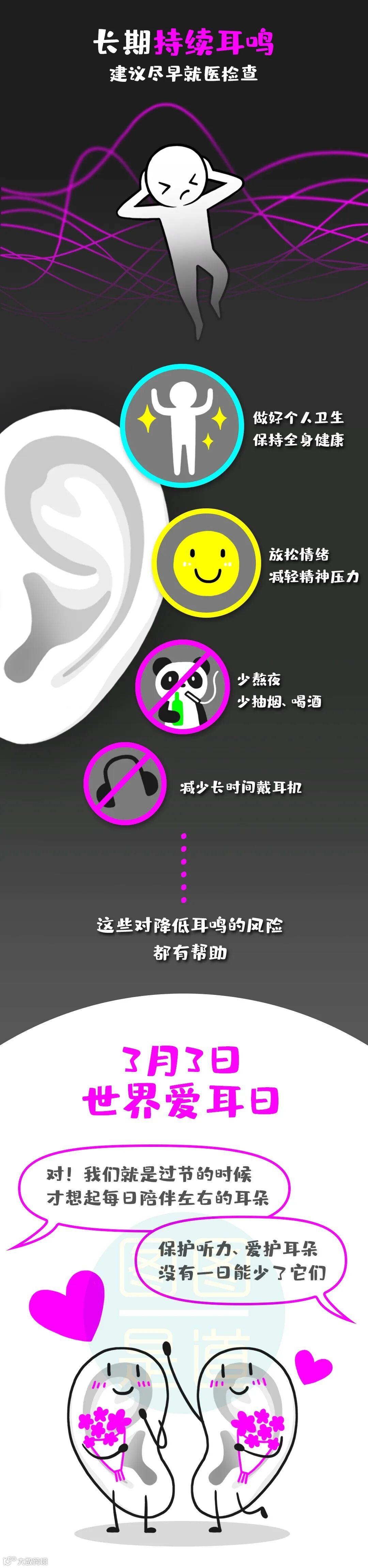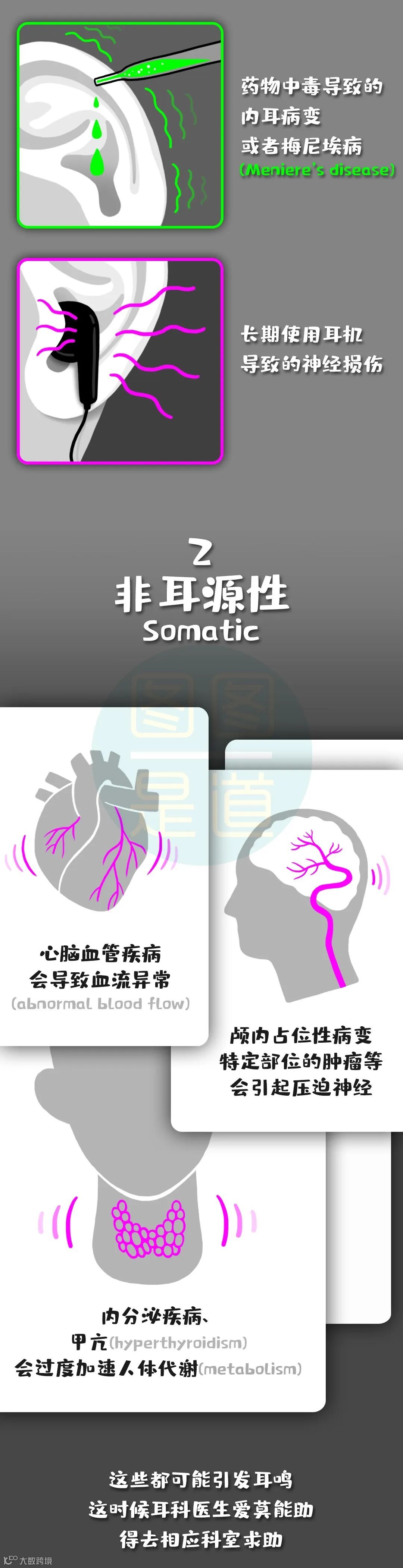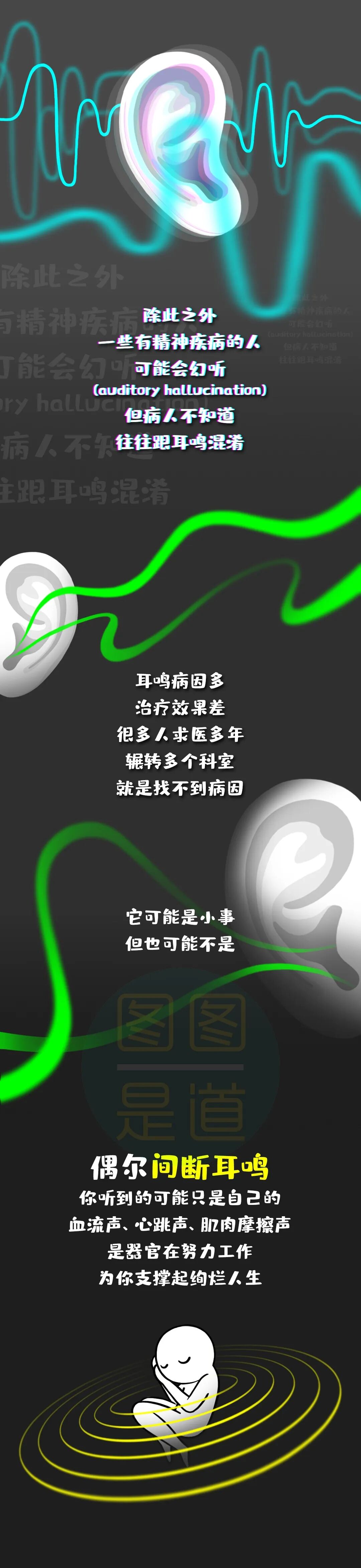 万籁俱寂,你的耳朵里开始上演一场大戏:沙沙~~嗡嗡~~叮叮~咣咣!耳鸣是个全球问题,大约7-14亿人受其困扰,大部分人夜间耳鸣,整晚免费欣赏“音乐会”,耽误睡眠,身体受不了啊!还有一些人醒着也耳鸣,被关不掉的声音缠久了,容易怀疑人生!耳鸣的原因有很多,能大致分为两大类。耳源性:声波要经过外耳、耳膜、中耳、内耳,才能产生听觉信号,再经听神经传给大脑知道,这叫听觉通路,任何一个环节出问题,都可能引起耳源性耳鸣,需要求助耳科医生;非耳源性:心脑血管疾病能导致血流异常,颅内占位性病变,特定部位的肿瘤都能压迫神经,内分泌疾病、甲亢,会过度加速人体代谢,都可能引发耳鸣,这时候耳科医生爱莫能助,得去不同科室求助。除此之外,一些有精神疾病的人可能会幻听,
