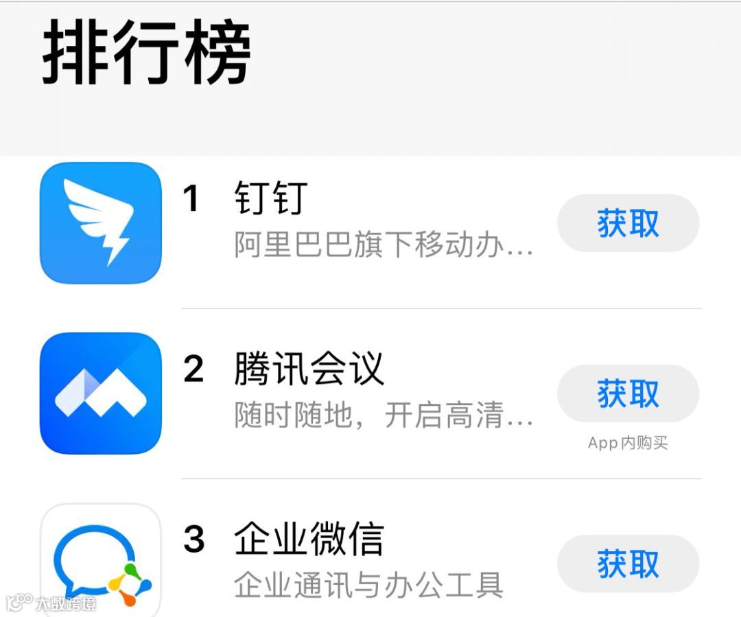 2月5日,“钉钉”和“腾讯会议”在 Apple Store上超过微信,位列排行榜前两名。这也是苹果应用商店里,办公类应用产品历史上首次跃居第一。