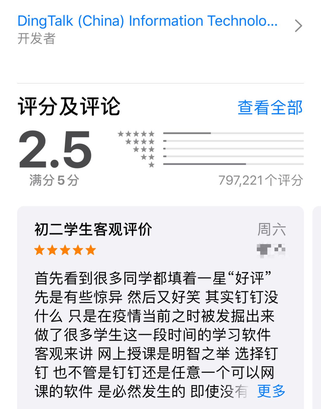 截止17日,钉钉评分回升至2.5分,最新的评论多为五星并配长文,呼吁勿恶意跟风给差评。