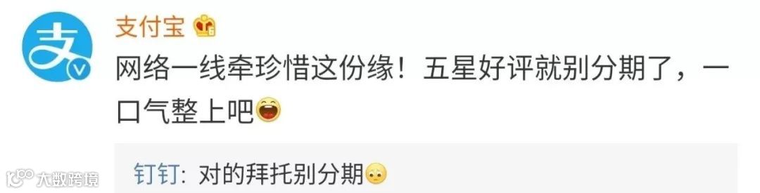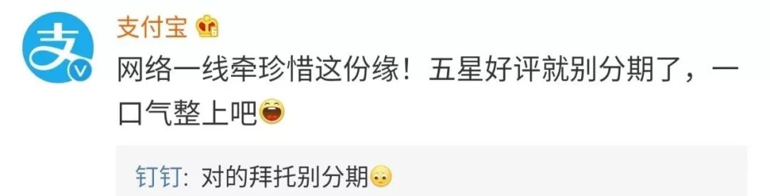 只有支付宝与众不同,助攻说道:“网络一线牵珍惜这段缘,五星好评就别分期了,一口气整上吧。”
