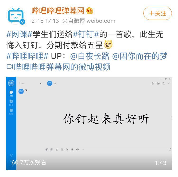 事情还没完。2月15日,有人在B站发布了一则改编歌曲《你钉起来真好听》,并称“此生无悔入钉钉,分期付款给五星”。