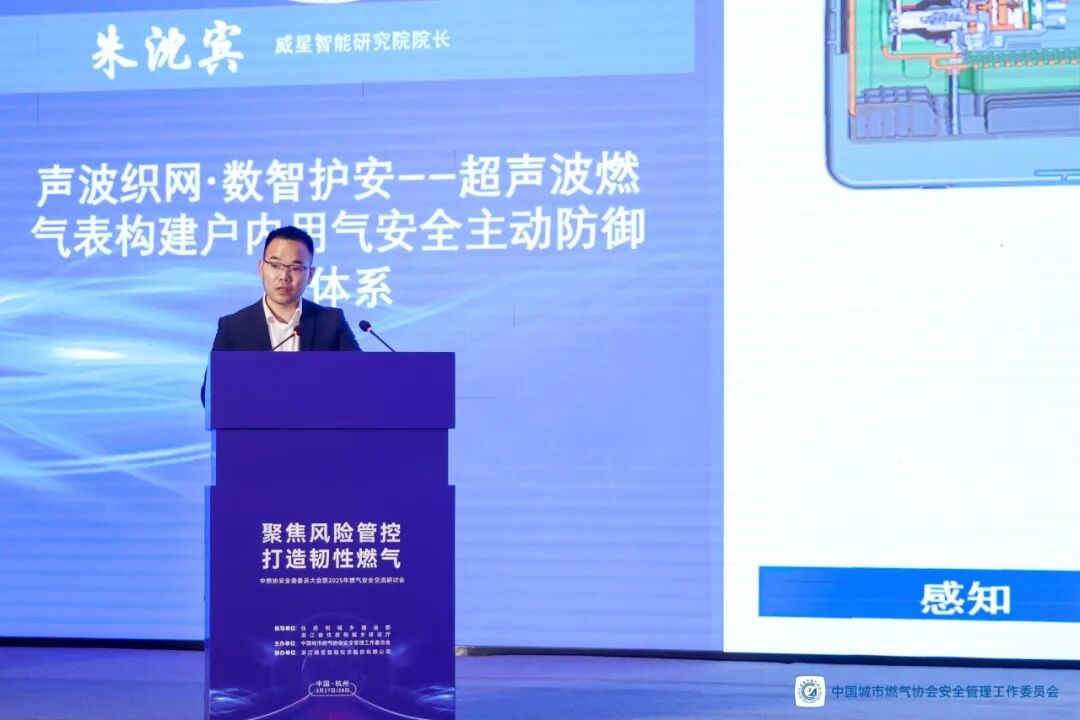 在27日下午的会议中,威星智能研究院院长朱沈宾发表了题为“声波织网·数智护安——超声波燃气表构建户内用气安全主动防御新体系”的演讲,分享了威星智能搭建的城市燃气户内安全主动防御体系以及在市场端的成功应用案例。该技术通过声波信号实时监测流量异常,结合AI算法精准识别微小泄漏,为家庭用户打造“无感式”安全防护网,引发与会专家高度关注。
