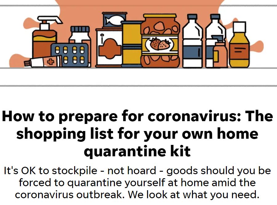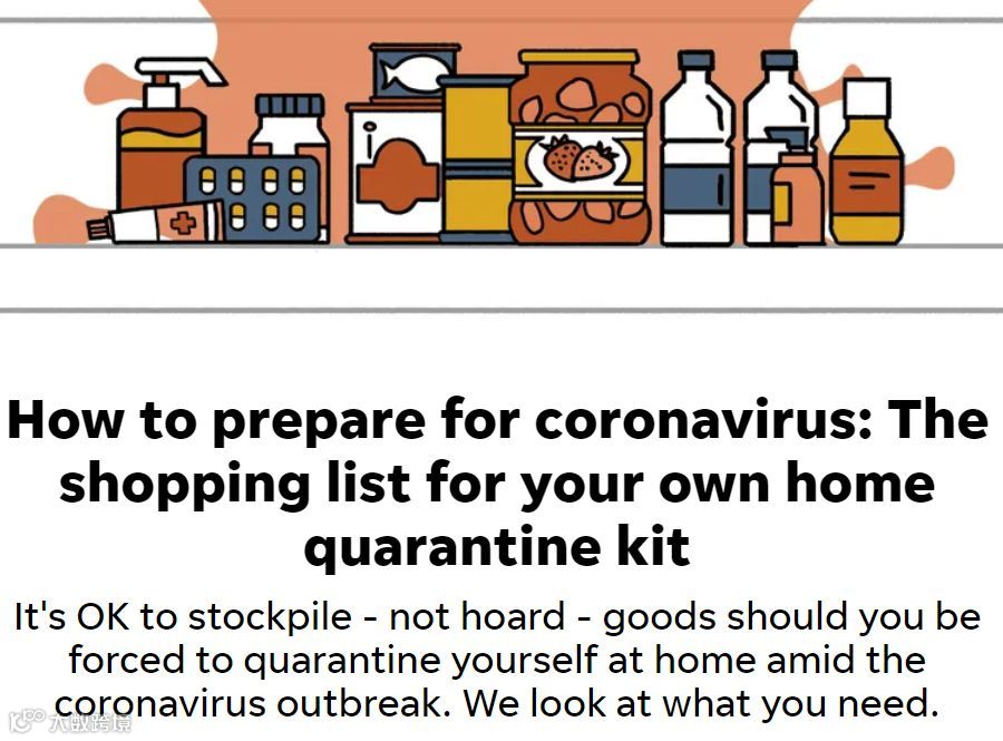 很多美国媒体出了“隔离囤货包”(home quarantine kit)的指南教程,告诉人民如果因为各种情况被隔离,如何准备两周的食物、药品和杂货。