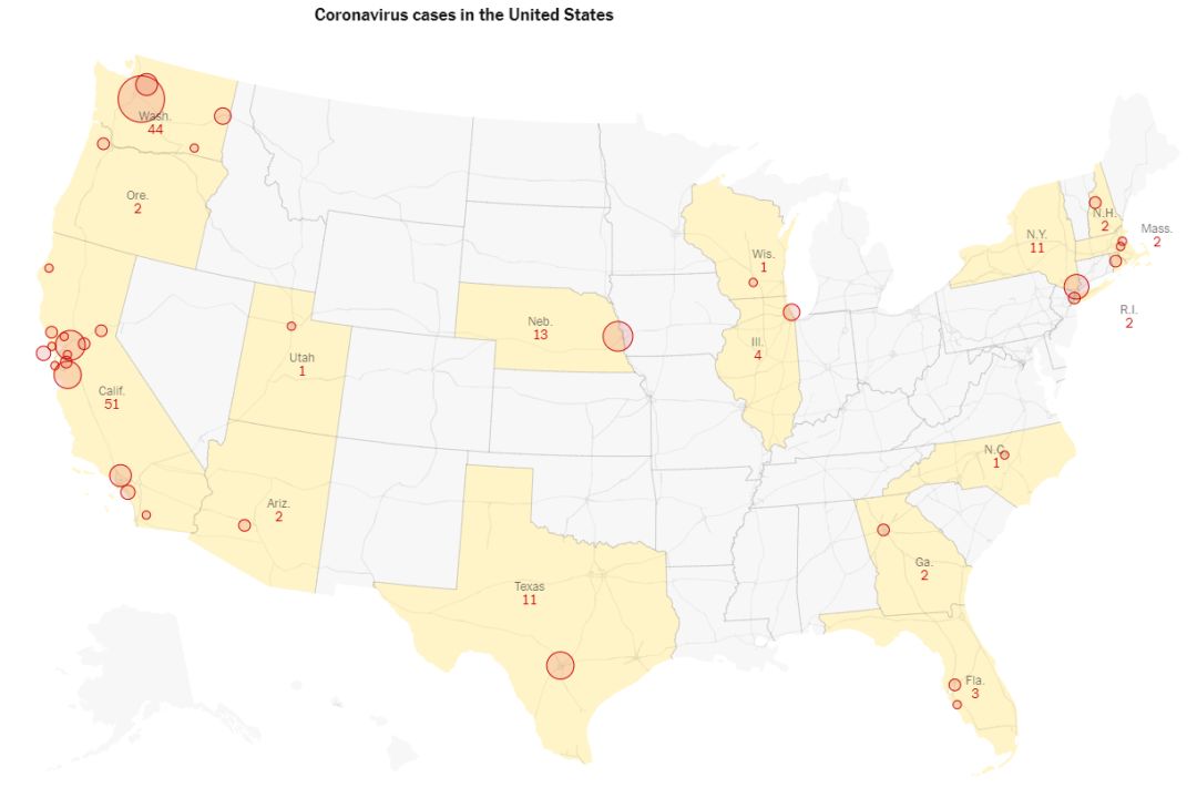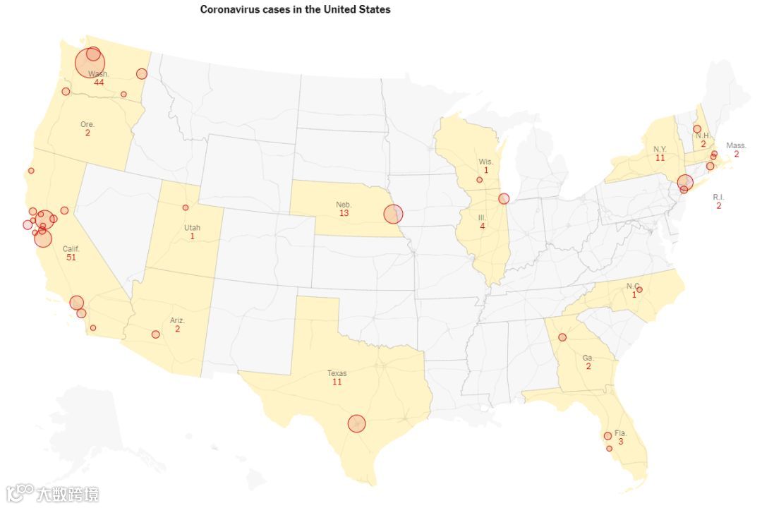 从《纽约时报》制作的全美疫情分布图来看,西岸是重灾区。截至当地时间4日下午,加州51例,华盛顿州44例,而且死亡的11例中有10例都在华盛顿州……其中8例死亡都与华盛顿州一家养老院有关。