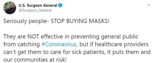 2月29日,美国卫生总署负责人杰罗姆·亚当(Jerome Adams)也发布推特,呼吁民众停止购买口罩: