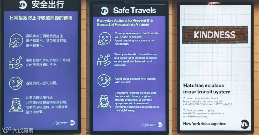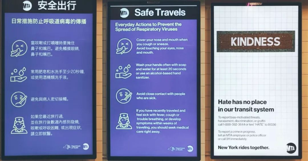 那段时间,我在纽约地铁看到轮播的广告中有以下三张图,分别是中文写的防止病毒传播的措施,前者的英文版,还有一则宣传广告,意思是鼓励大家看到类似仇视骚扰情况要向有关部门举报。我想这也许反映了疫情之下,在政治正确和合理担忧之间撕扯的美国社会。